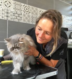 Ik trim de kat dus in zijn eigen huis. Wanneer dat niet lukt, bijvoorbeeld omdat de kat in zijn eigen omgeving te zelfverzekerd is, verwijs ik door naar een collega met een salon. Soms zijn de katten in een vreemde omgeving makkelijker te trimmen.